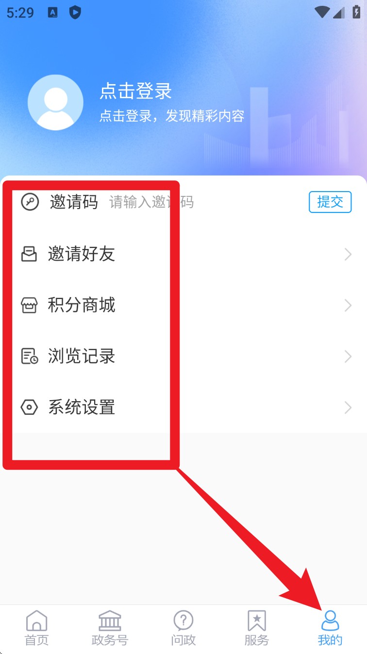 5.打开我的页面,登录后可查看浏览记录、积分商城、邀请好友等功能,还能调整系统设置。
