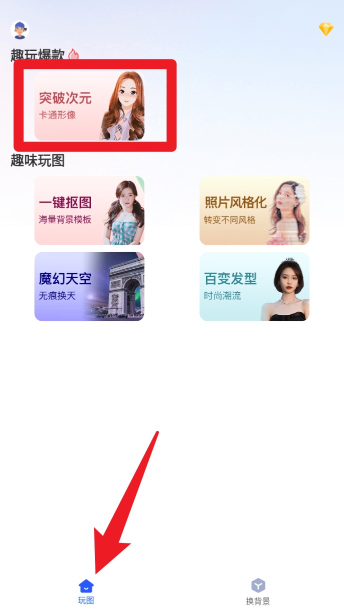 1. 在首页点击下方玩图按钮,进入后选择上方的突破次元卡通形象功能入口。