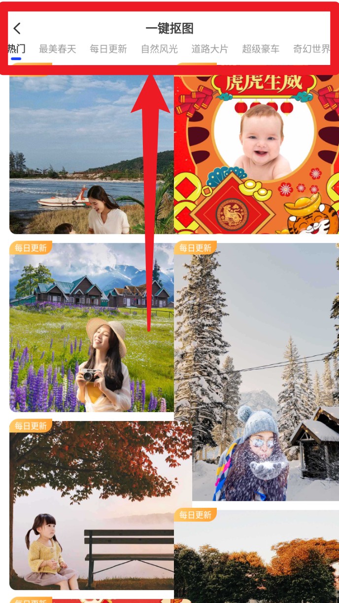 4. 抠图页顶部可左右滑动分类标签,自由切换主题场景,如春天、城市、梦幻等。