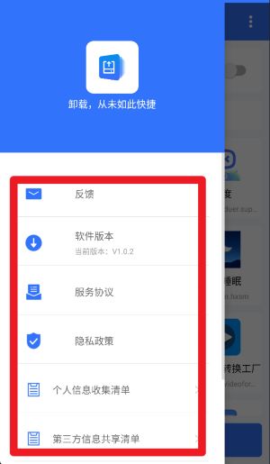 2、侧边菜单中可查看软件版本、反馈入口以及隐私政策与信息收集清单内容。