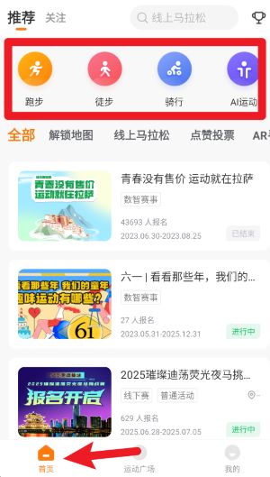 1、打开APP,在首页界面点击上方的跑步、徒步、骑行,即可快速切换并进入相应的运动模式开始记录。