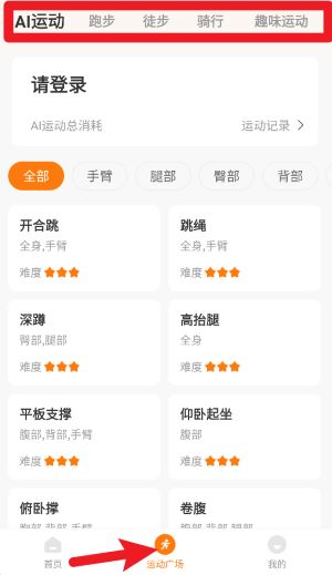 2、在底部点击运动广场按钮后,可进入AI运动页面,选择部位分类查看不同运动项目并进行锻炼操作。