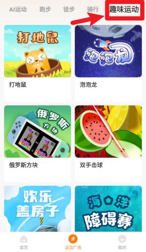 3、切换至趣味运动栏目后,可选择如打地鼠、泡泡龙等游戏方式进行锻炼,增加运动过程的互动与乐趣。
