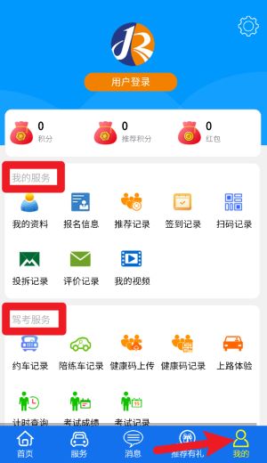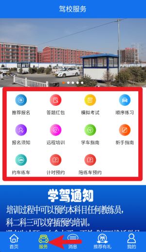 2、在服务界面中可以快速进入报名须知、约车预约、远程培训等学车相关服务功能模块。