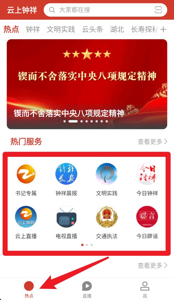 1、点击底部热点图标,可进入热点页面,浏览最新时政宣传内容及便民服务入口。