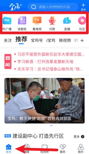 2、在首页中可浏览推荐内容,点击上方图标快速进入广播、读报纸、电视、问政等功能模块。