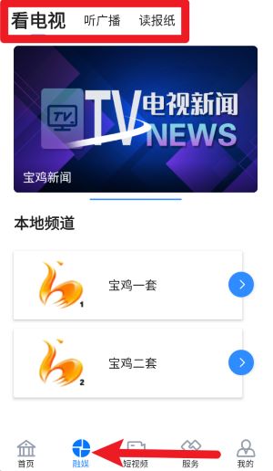 3、点击底部融媒栏目后可观看宝鸡新闻及本地频道,包括宝鸡一套与宝鸡二套电视内容。