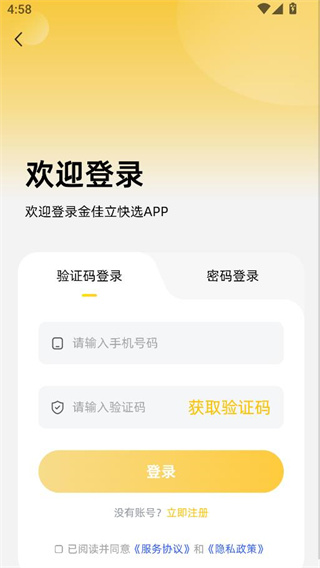 1、在手机上下载安装金佳立快选APP,阅读服务协议并点击同意。