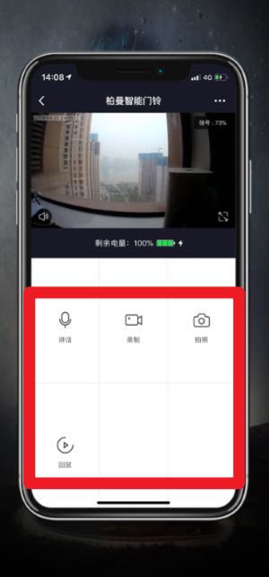 2、在智能门铃功能界面中,可选择讲话、录制、拍照等操作,支持远程语音互动与现场画面记录。