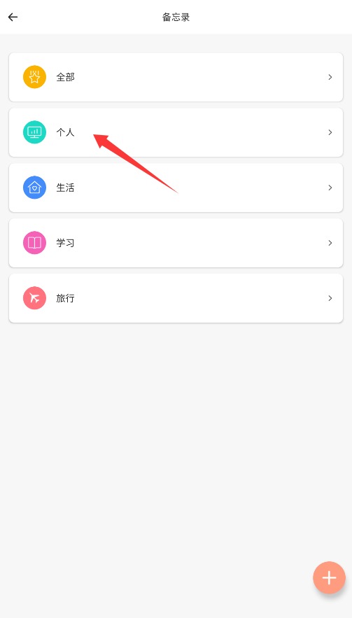 2、在分类选项中选择备忘录类型,个人、生活、学习、旅行进入编辑页面开始记录。