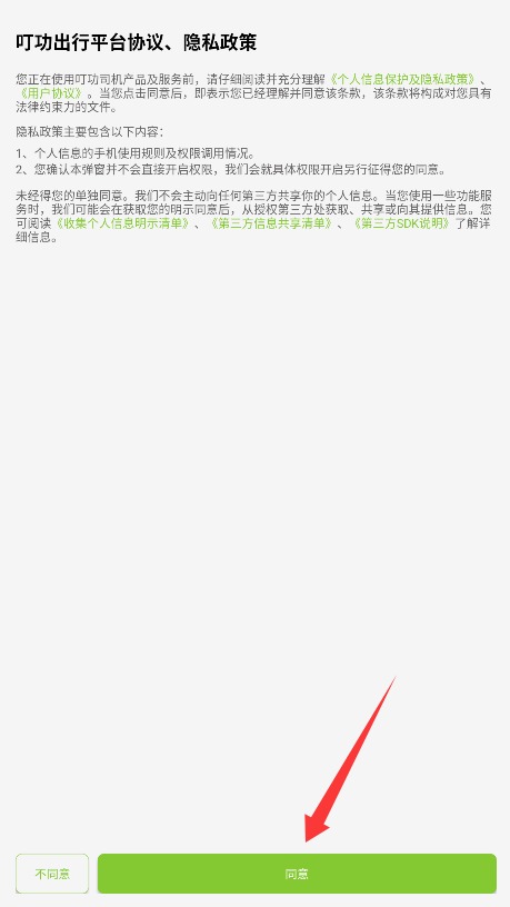 1、初次使用需完整阅读平台服务条款与隐私政策,确认后点击同意按钮进入应用。