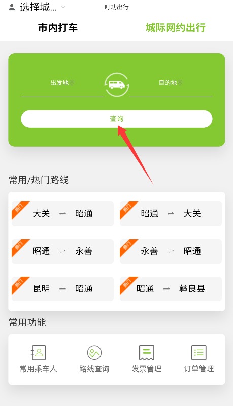 3、在首页输入出发地和目的地,点击查询车辆即可查看附近可用网约车信息并叫车。