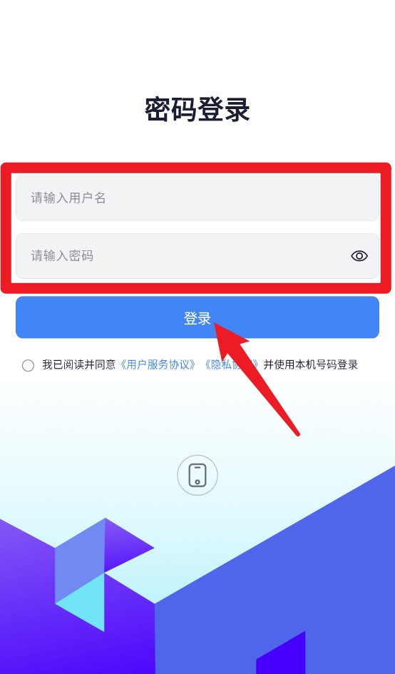 1、打开应用后进入登录页,输入用户名和密码,点击蓝色按钮完成密码登录并进入主页面。