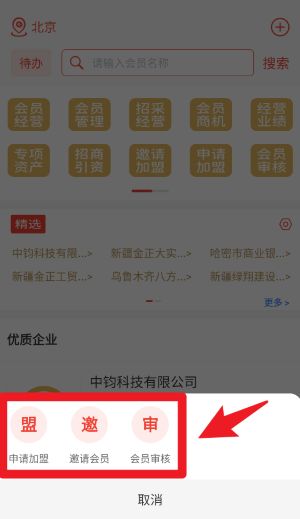 3、点击分类页面下方弹出框,可进行申请加盟、邀请会员及会员审核操作,完成会员相关管理任务。