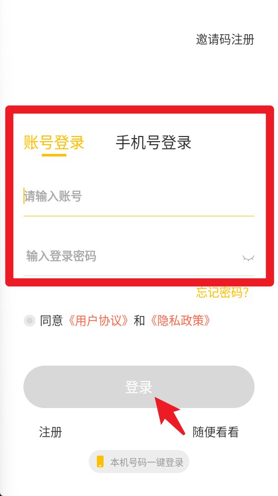 1、打开应用进入登录界面,支持账号和手机号两种登录方式,输入信息后点击下方登录按钮完成登录。