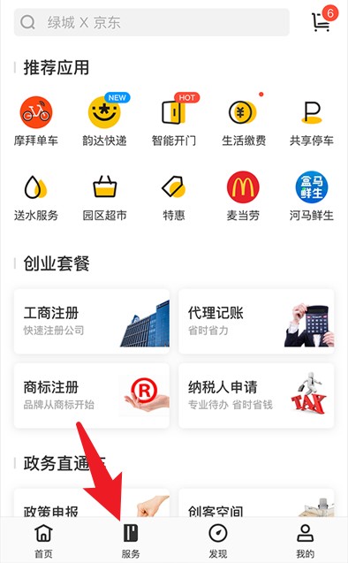 3、点击底部服务按钮,进入综合服务页面,可查看推荐应用和创业套餐等便捷功能模块。