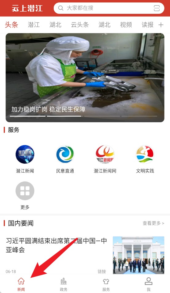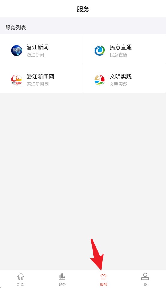 3、点击服务页面可查看潜江新闻、民意直通、文明实践等便民服务入口。
