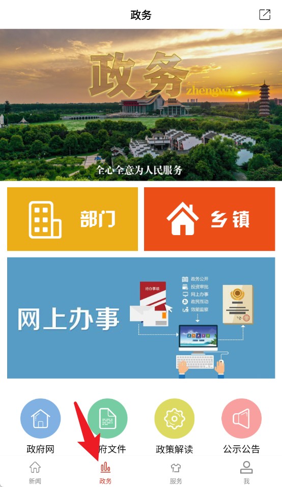 2、在政务板块中可查看政府部门、乡镇信息及政务文件与政策解读内容。