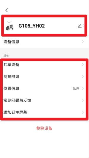 1、点击设备设置页面可查看车辆编号,支持修改名称、共享设备、设定位置权限及移除当前车辆。