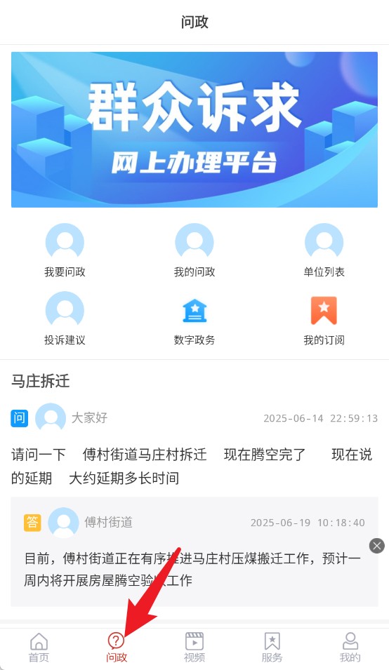 2、进入问政板块可在线提交诉求,查看我的问政、单位列表和处理进度。