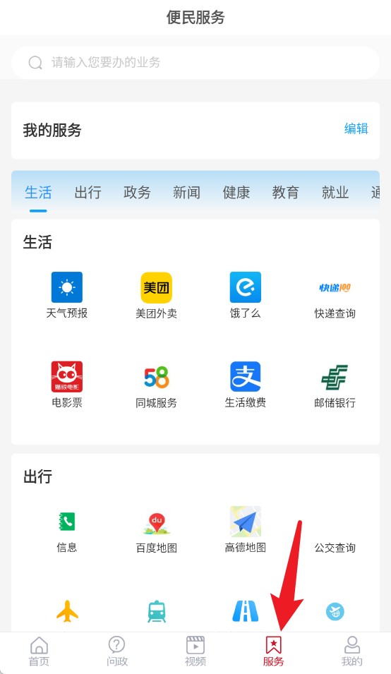 4、点击服务进入便民服务平台,可查天气、快递、外卖、地图等常用工具。