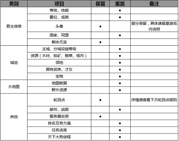 A:游戏角色数据重置,角色头像、剩余元宝等信息将会继承。具体可参考下表