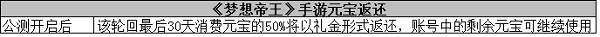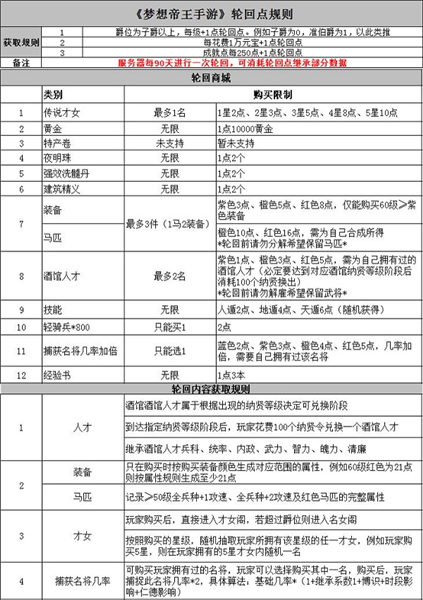 A:轮回角色可继承轮回点,并且服务器轮回前30天内消费的50%以及剩余的元宝,将按以下规则进行返还。