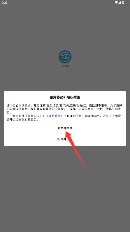 1、初次使用需阅读平台服务条款与隐私政策,确认后点击同意并继续按钮进入应用。