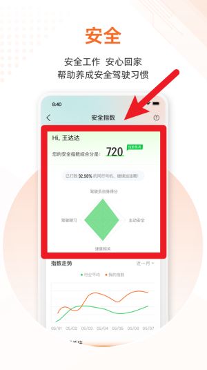4、安全指数功能可实时评估驾驶行为得分,通过图表分析帮助司机养成良好的安全驾驶习惯。