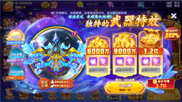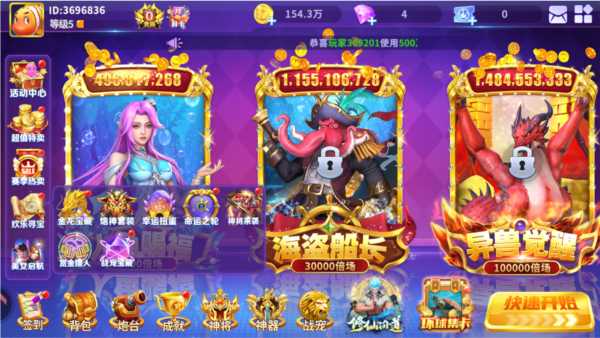 提供多种劲爽酷炫的炮台皮肤与子弹特效,还有造型华丽的多样翅膀可供搭配。在畅享捕鱼乐趣的同时,能以惊艳的外观造型震撼全场。