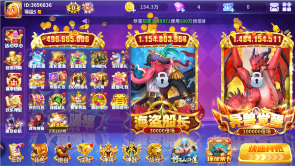 装备多种威力惊人的超级武器,例如雷霆万钧的雷神锤、毁天灭地的神龙吐息、能横扫全场的超级弹头。让鱼群和BOSS在强大威势下无所遁形,带来爽快无比的捕鱼感受。