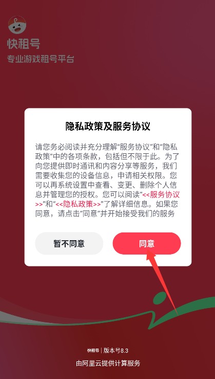 1、初次使用需完整阅读平台服务条款与隐私政策,确认后点击同意按钮进入应用。