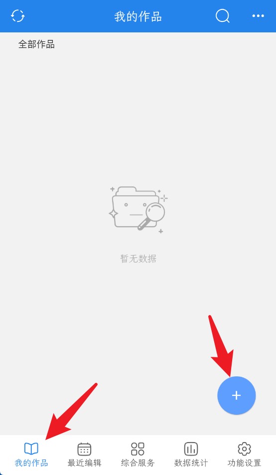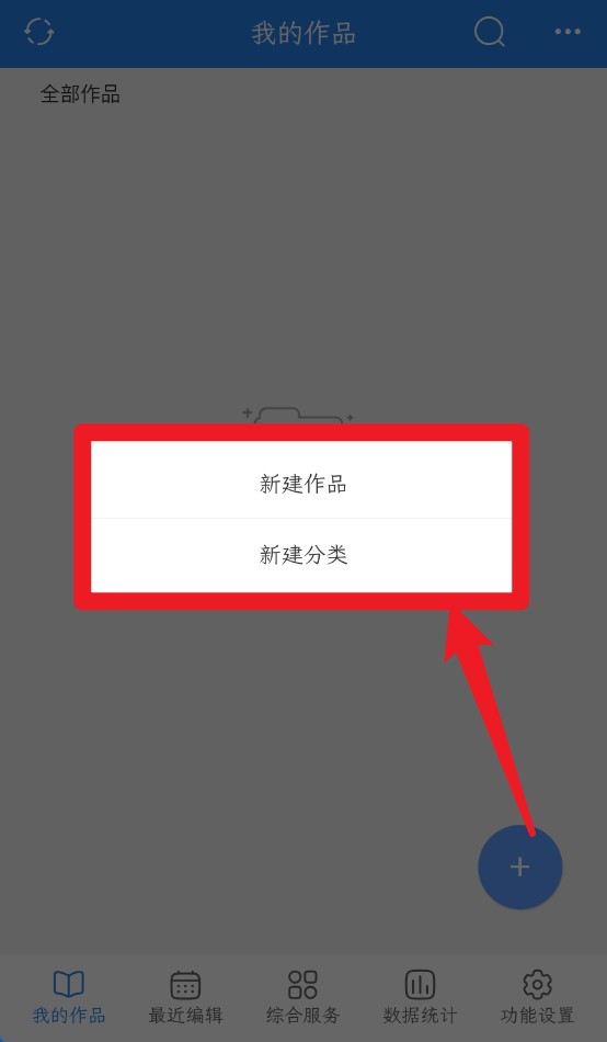 1、点击我的作品可查看所有文档内容,点击右下角加号可新建作品或分类管理。