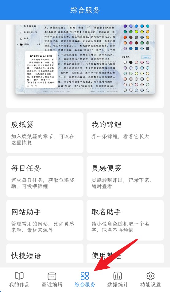 3、综合服务页面提供每日任务、废纸签、网站助手等多种功能,支持创作辅助。