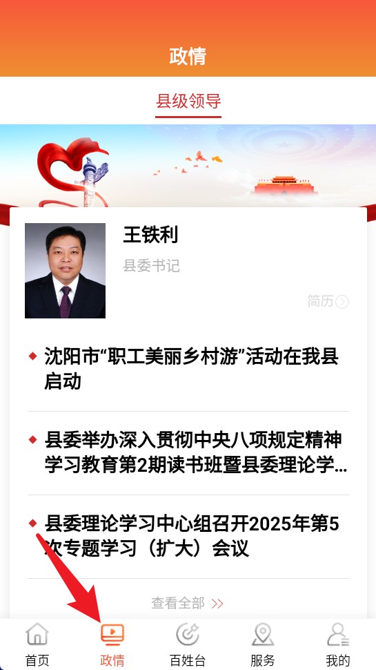 2、点击底部政情按钮进入领导信息专区,查看县级领导简介及相关活动动态。
