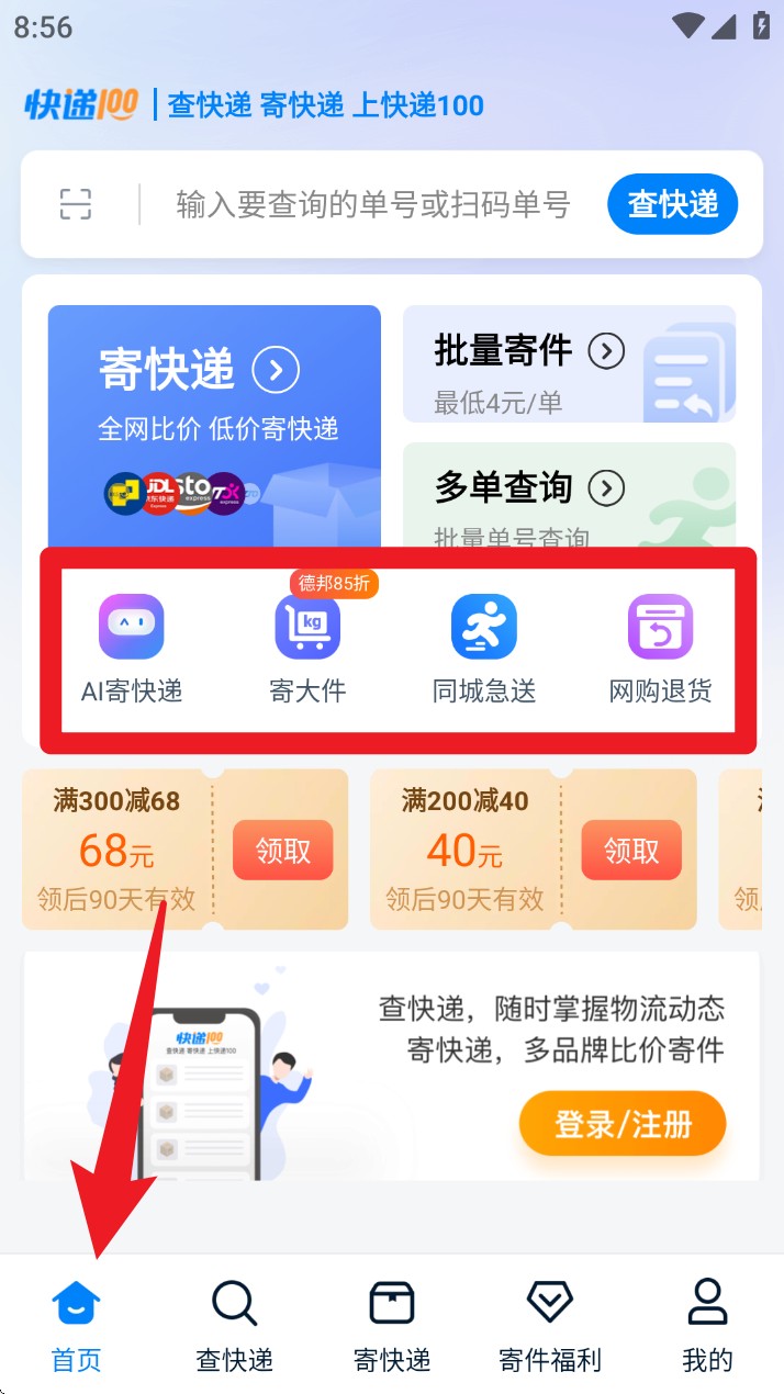 1.进入首页后点击寄快递,可选择AI寄件、寄大件、同城急送等服务,满足不同场景寄件需求,操作便捷直观。