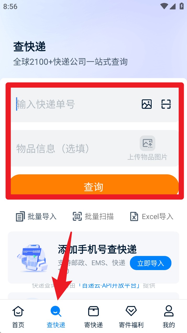 2.点选底部查快递,输入快递单号或扫码查询包裹状态,支持添加物品信息和图片,方便多单管理。