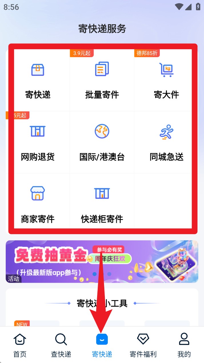 3.点击寄快递标签进入寄件服务页,支持批量寄件、网购退货、商家寄件等多种类型,选择更灵活。