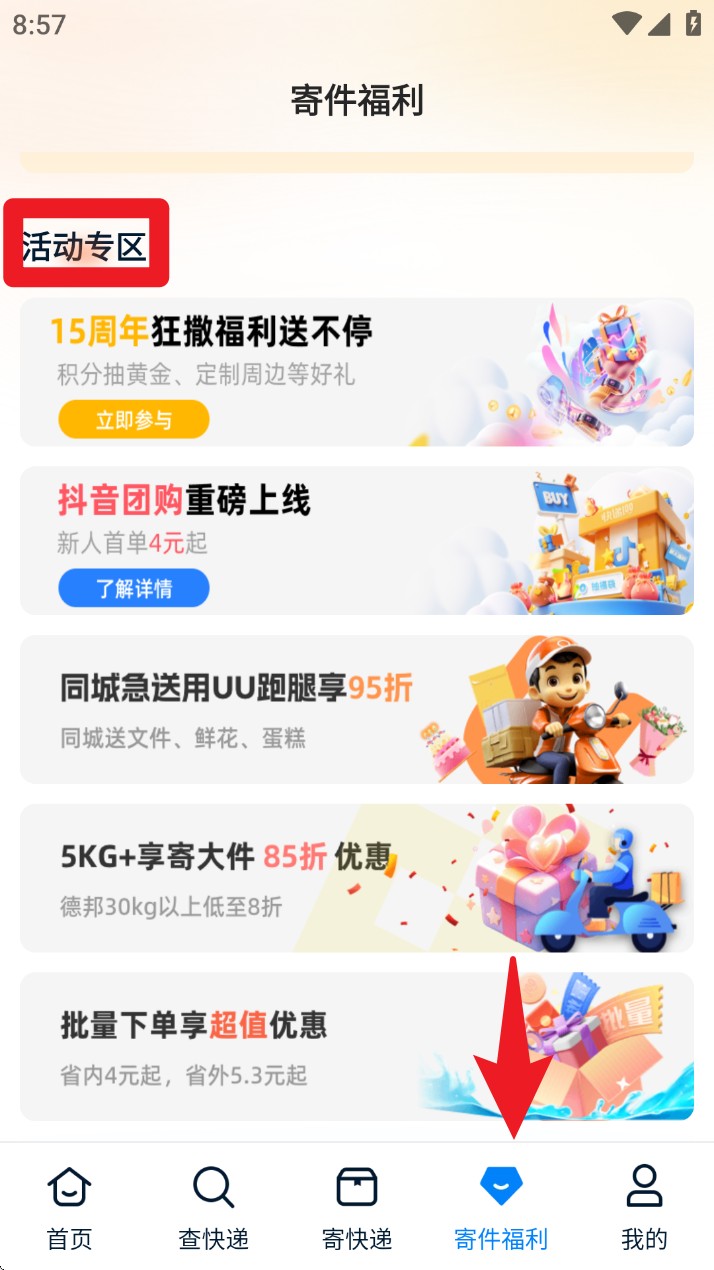 4.进入寄件福利页可参与活动专区,享受运费折扣、优惠券发放及专属寄件补贴,寄得多省得多。