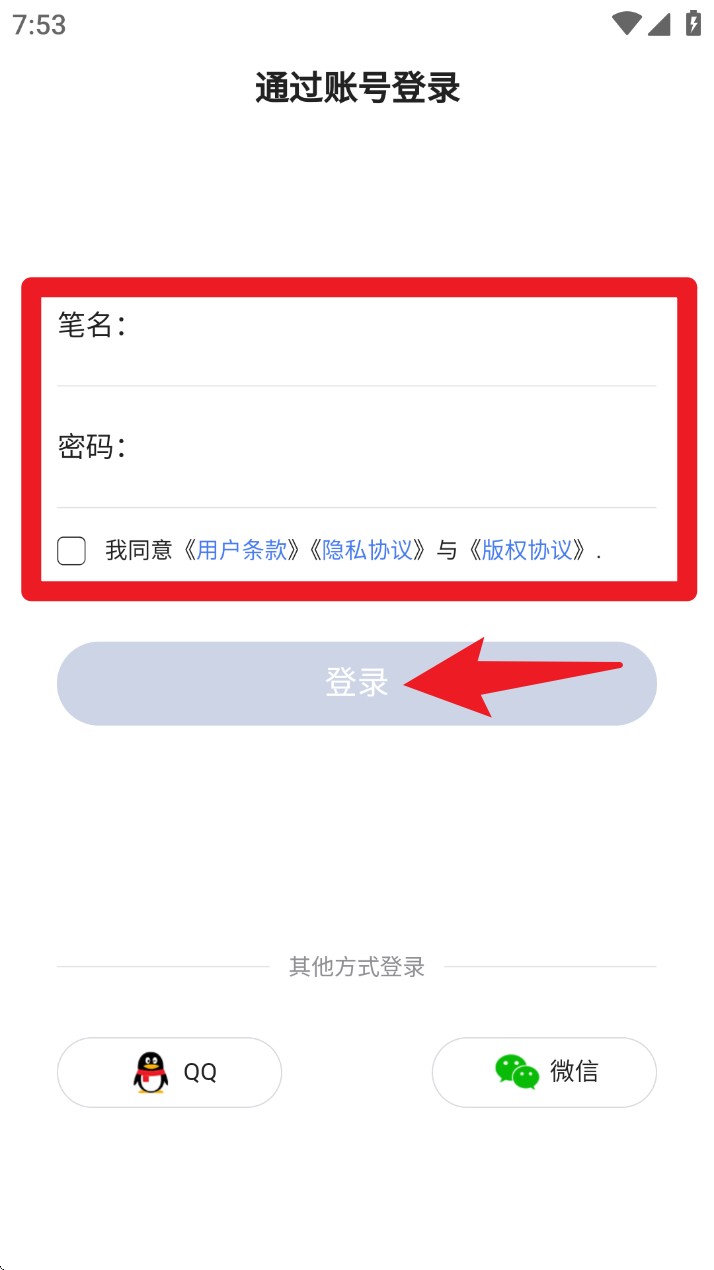 1. 打开App后进入登录页面,输入笔名与密码并勾选协议,同意后点击登录按钮,也可选择使用微信快捷登录。