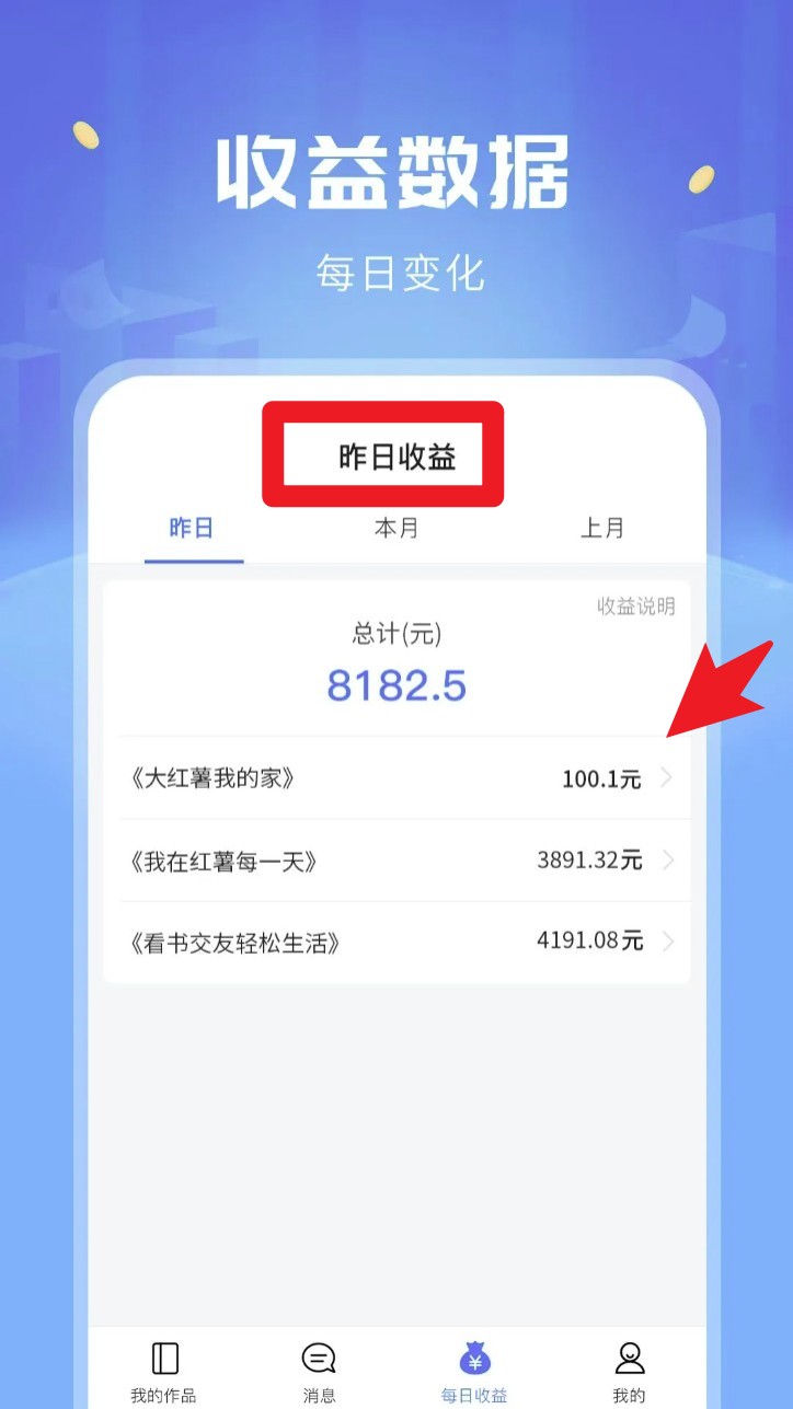 2. 登录成功后点击底部导航栏的每日收益,可查看昨日、本月及上月的稿费数据,收入来源按作品明细进行展示。