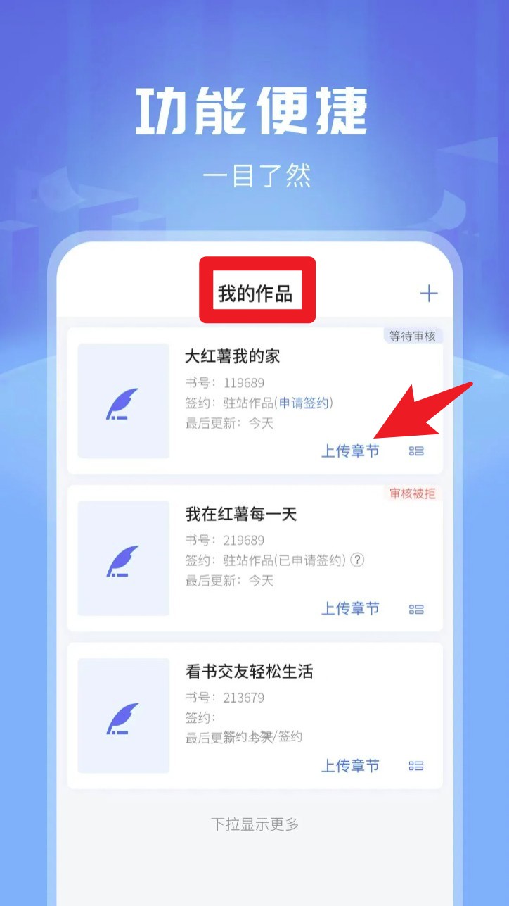 3. 点击底部的我的作品模块,可查看作品列表、更新状态与签约情况,并支持上传新章节进行持续创作。