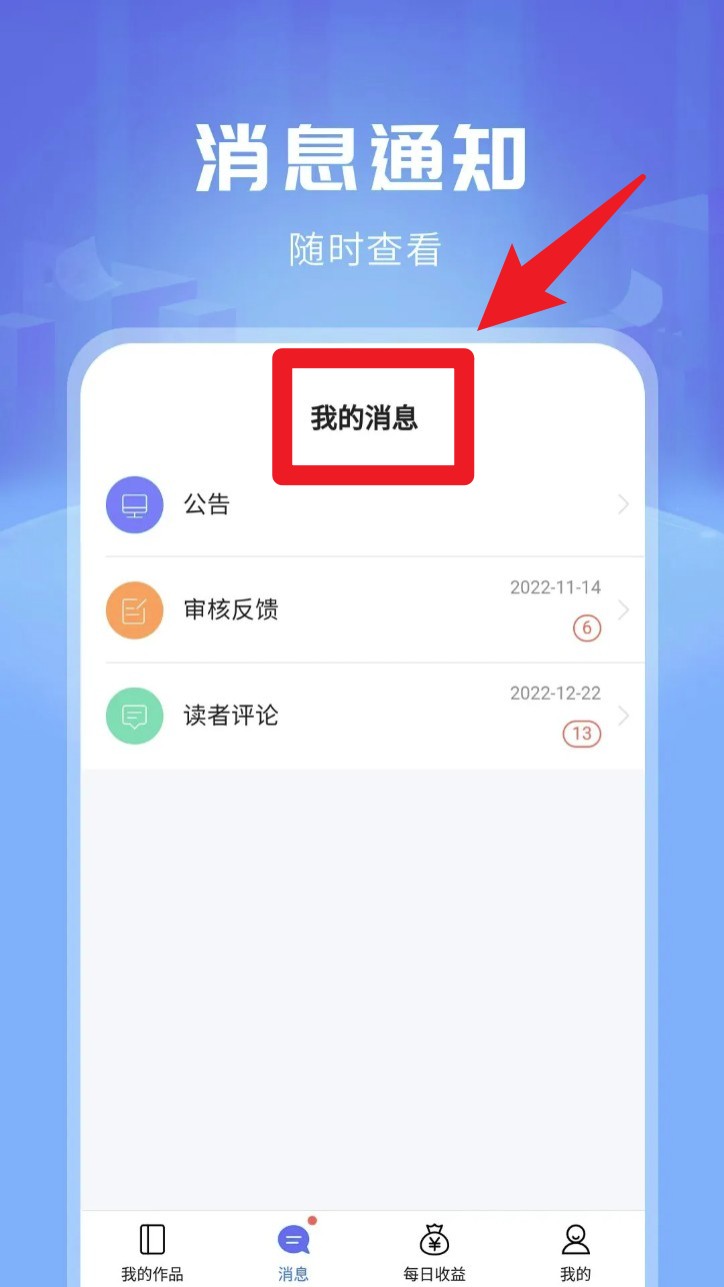 4. 有消息提醒时可点击消息标签页,进入我的消息查看审核反馈、公告更新及读者评论,确保不错过重要通知。