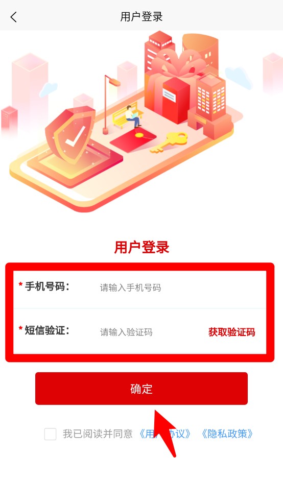 1、进入登录界面后,输入手机号码并获取验证码,填写后点击确定按钮完成登录操作。