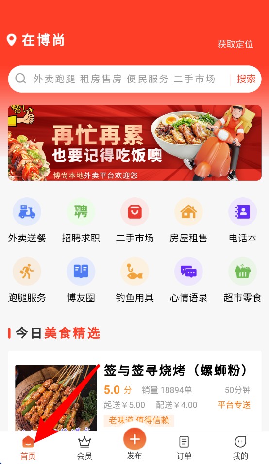 2、登录后进入首页,可搜索外卖跑腿、房屋信息等多种服务,操作便捷一目了然。