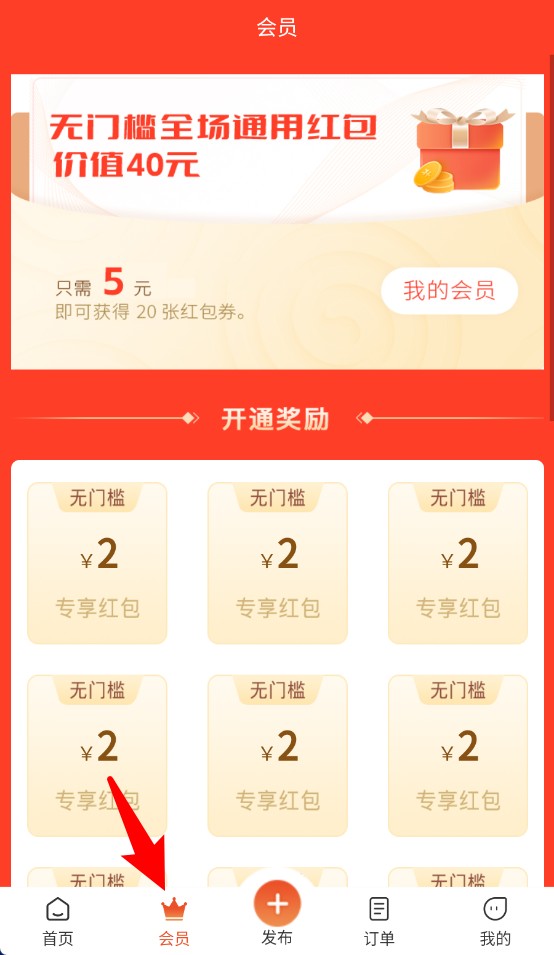 3、点击底部会员栏目,可查看并领取无门槛红包,享受会员专属优惠福利。