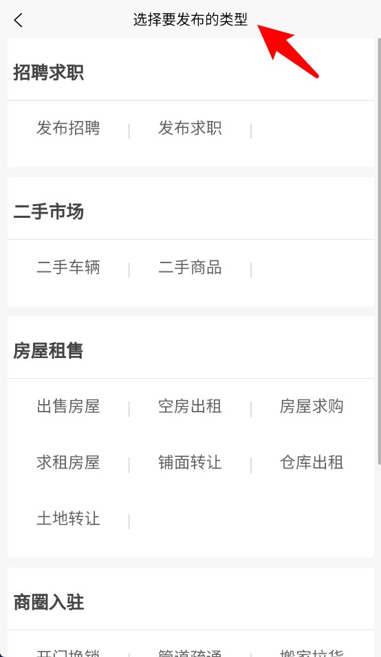 4、点击中间发布按钮,在分类页面中选择发布内容类型,如招聘、二手房等。