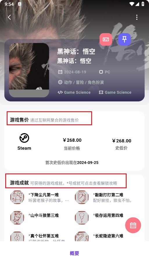 3、点击游戏封面进入详情页,可查看游戏在对应平台的售价,还能了解游戏攻略与成就信息。