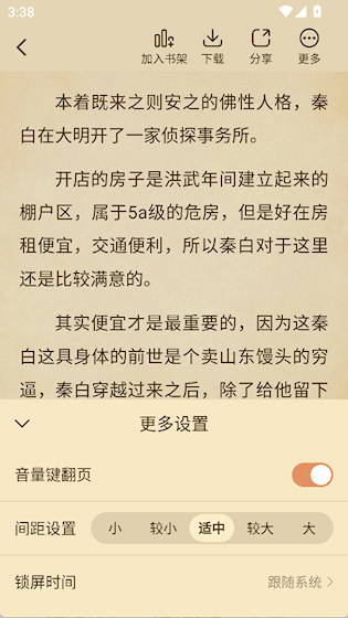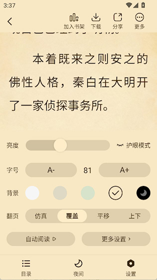 3、调整阅读界面:根据光线环境切换白天/夜间模式,调节字体大小和行间距,减少眼睛疲劳,提升舒适度。