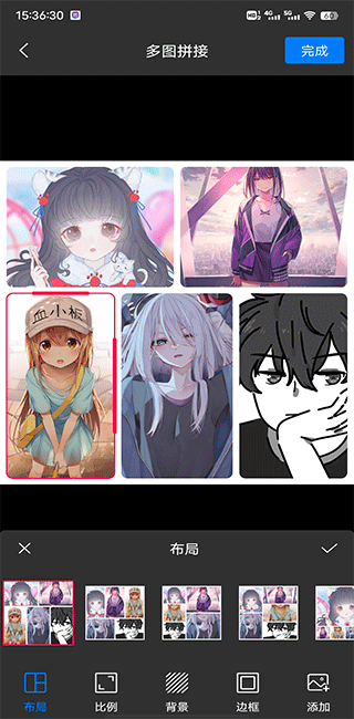 3、多图拼接:可挑选多张图片拼接,还能调整布局、比例、背景等